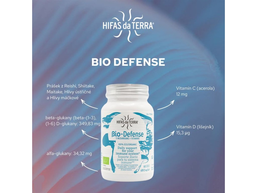 Složení v 1 kapsli Bio-Defense: bio prášek z plodnice: Pleurotus ostreatus (Hlíva ústřičná) 115 mg (16,68 %), Pleurotus eryngii (Hlíva máčková) 115 mg (16,68 %), Grifola frondosa (Maitake - Trstnatec) 100 mg (14,5 %), Lentitula edodes (Šiitake - Houževnatec jedlý) 95 mg (13,78 %), Ganoderma lucidum (Reishi - Lesklokorka lesklá) 90,74 mg (13,16 %), bio extrakt z Malphigia glabra (Acerola) [poskytuje 6 mg vitamínu C (kyselina L-askorbová) - 7,5 %*], bio extrakt z Cladonia rangiferina (lišejník) [poskytuje 10 µg vitamínu D3 (cholekalciferol) - 200 %*], rostlinná kapsle (hydroxypropylmethyl-celulóza). * % referenční hodnoty příjmu vitamínů.