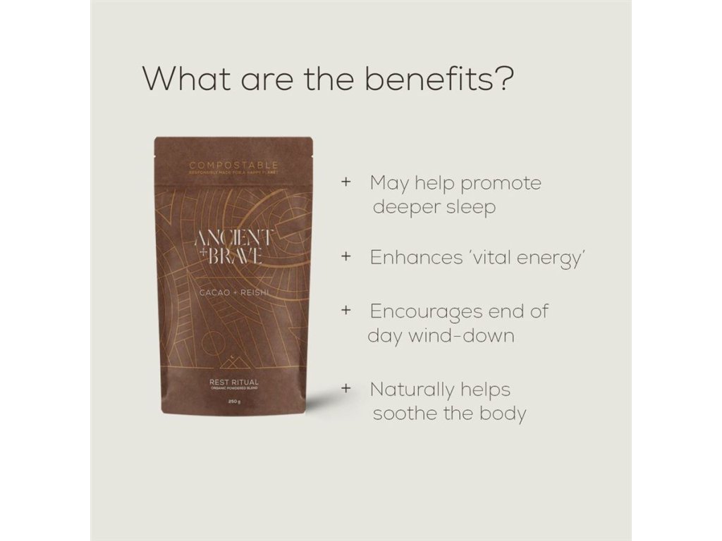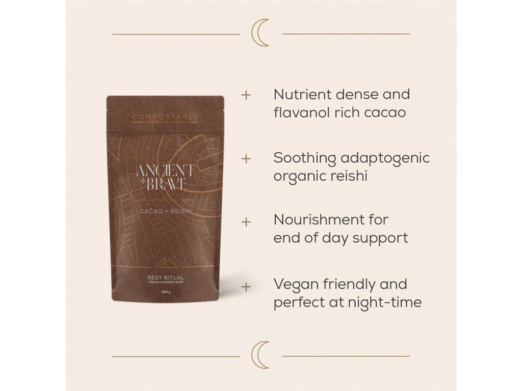 Cacao + Reishi je jedenáctisložkový metabolický optimizér určený pro navození pocitu klidu a soustředění během každého dne i během náročného stresujícího období. Prémiová kvalita a kompozice produktu je optimalizována pro ideální začátek dne a to jak v rámci účinného prodloužení přerušovaného půstu (Metoda Brave), tak pro posílení, vitalizaci a restart organismu v rámci normálního režimu. Delikátní sametovou chuť syrového peruánského kakaa si můžete vychutnat ve vysoce účinné synergní směsi, která se skládá z jedenácti bioaktivních složek: