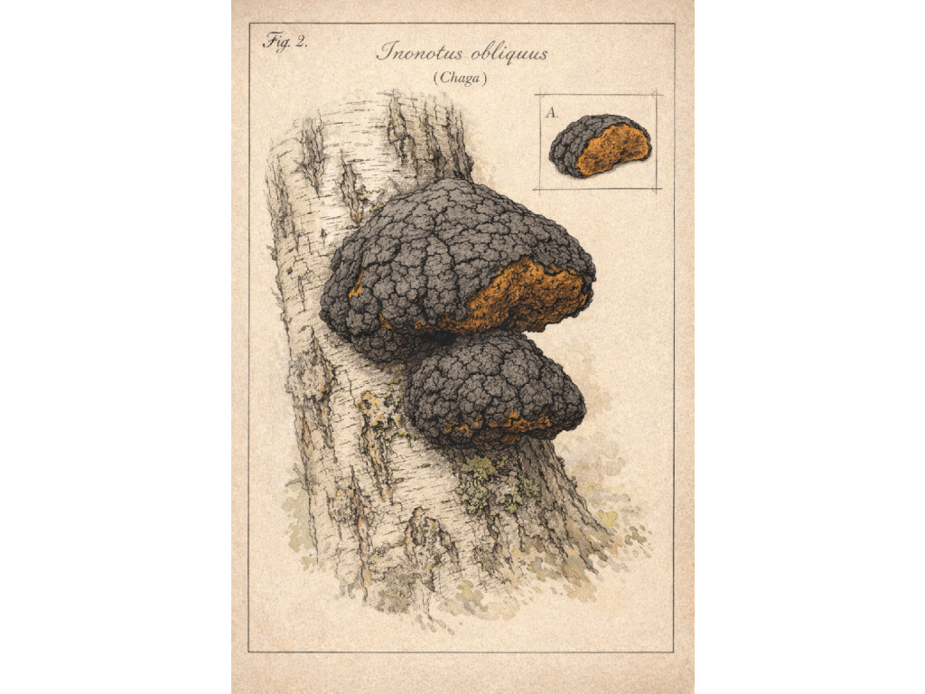 Čaga je populární i proto, že nejde jen o „další houbu do sbírky“. Má silný tradiční příběh, charakteristický původ na bříze a zároveň velmi zajímavé přirozené složení, díky kterému si drží výjimečné postavení mezi produkty z kategorie adaptogeny a vitální houby.