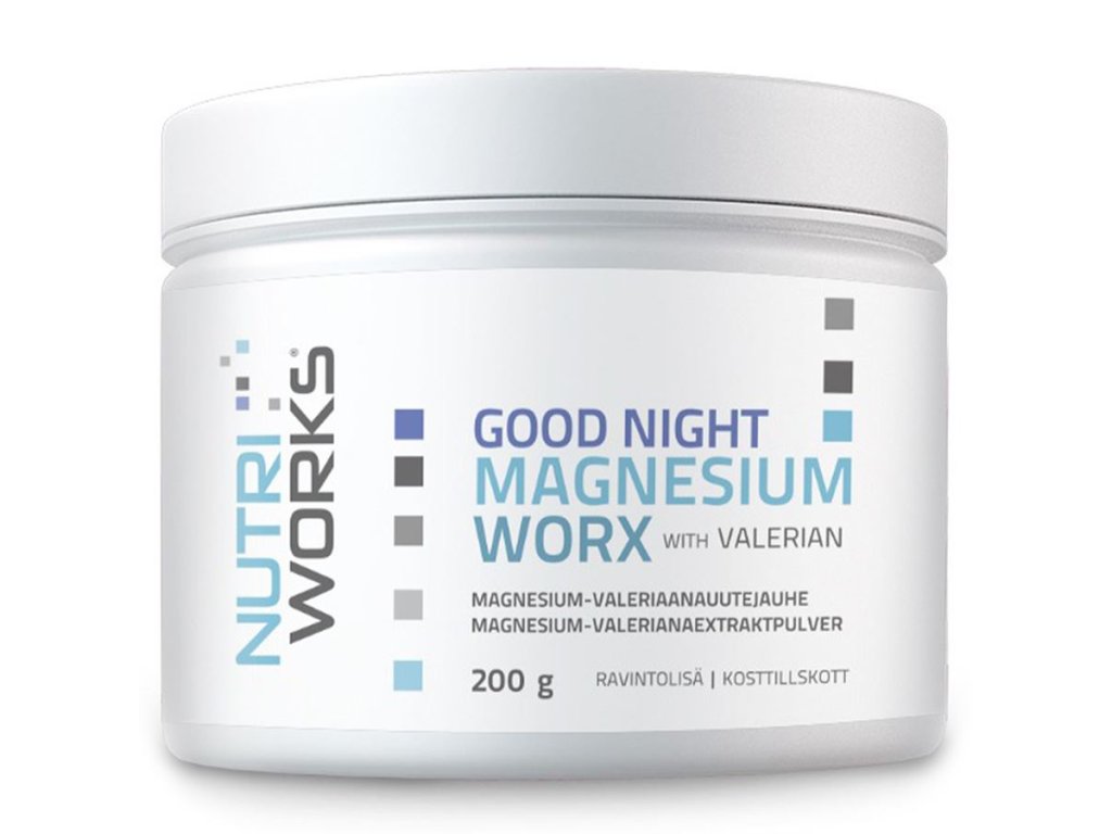 Good Night Magnesium představuje komplexní doplněk pro podporu spánku. Při náročném období (stresu, velké zátěži nebo i při náročném fyzickém tréninku) je tělo (nervová soustava) stimulovaná natolik, že může být obtížné "vypnout". S tím mohou pomoci přírodní látky. Všechny obsažené složky, hořčík, kozlík, theanin, tryptofan i vitamín B6 mají vlastnosti související s nervovou soustavou, pocitem klidu a relaxace, kvalitou spánku a spánkovým režimem.