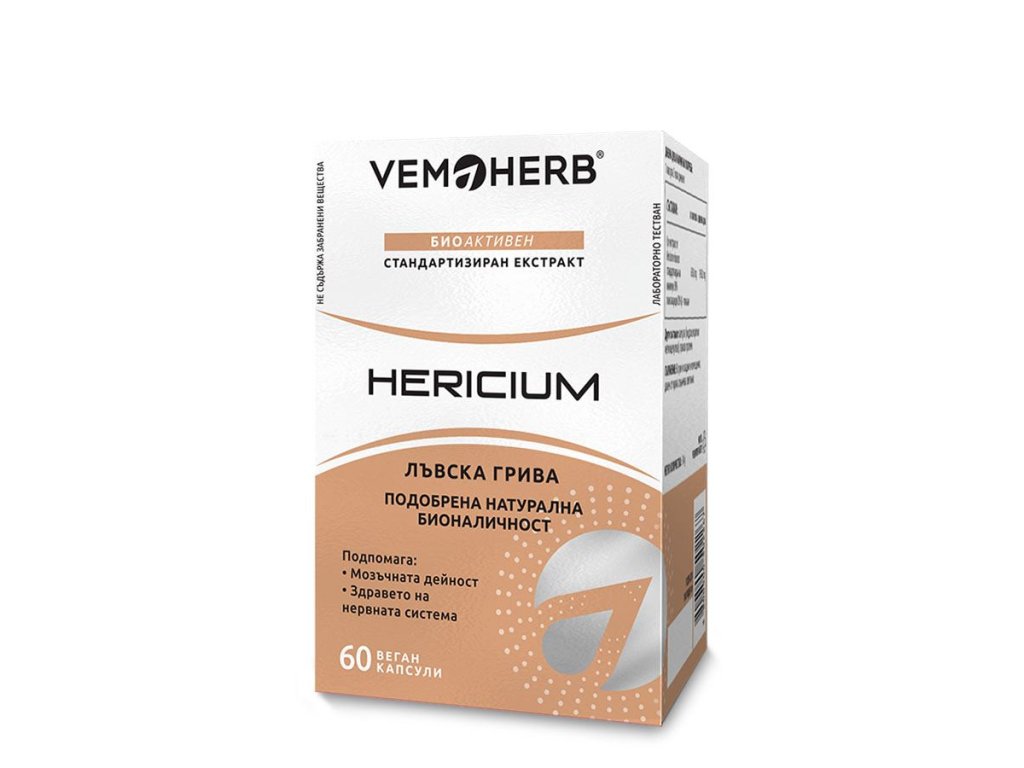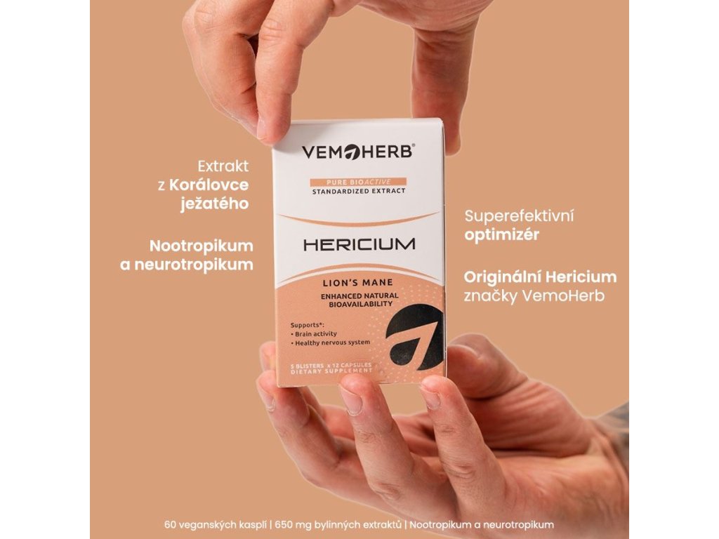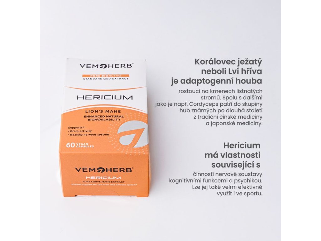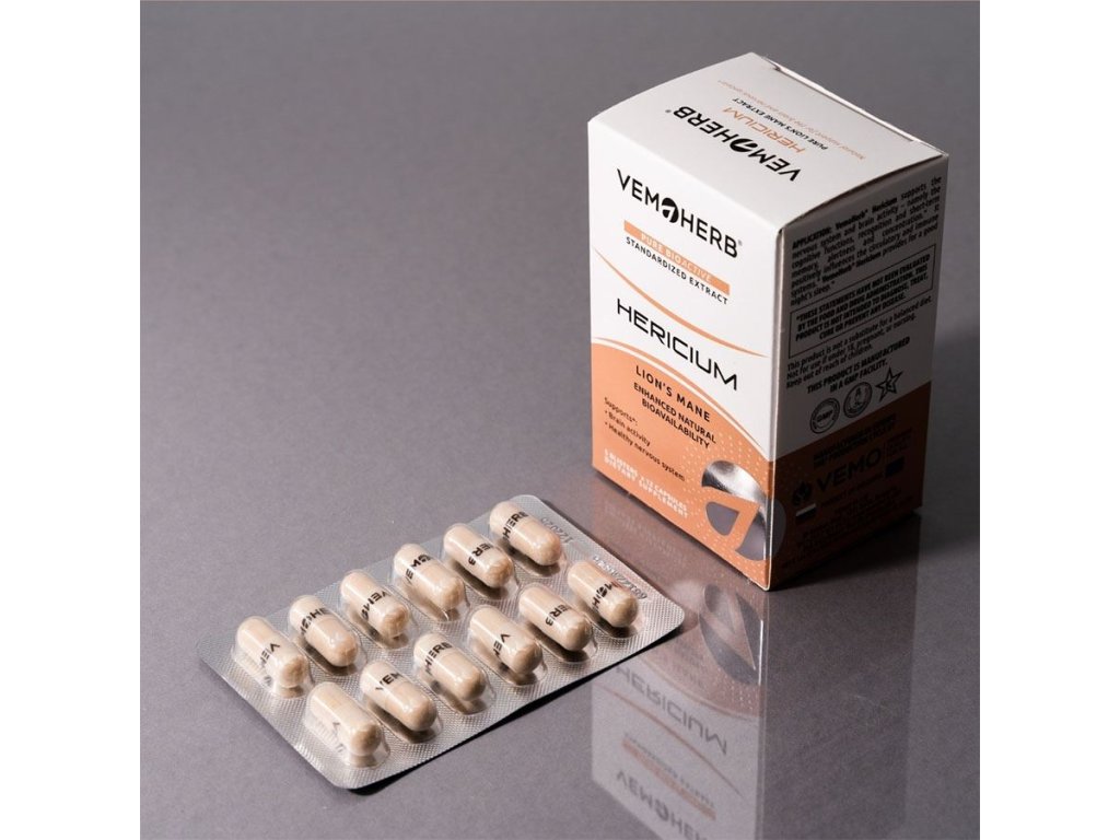 VemoHerb Hericium v novém praktickém balení v blistrech. Doplněk obsahuje 650 mg extraktu z Korálovce ježatého v 1 kapsli. Korálovec ježatý neboli Lví hříva je adaptogenní houba rostoucí na kmenech listnatých stromů. Spolu s dalšími jako je např. Cordyceps patří do skupiny hub známých po dlouhá staletí z tradiční čínské medicíny (Hóu tóu gu - Houba opičí hlava) a japonské medicíny (Yamabushitake - Houba horských mnichů). V současnosti je znovu objevován jejich ohromující potenciál. Hericium má vlastnosti související s činností nervové soustavy, kognitivními funkcemi a psychikou. Lze jej také velmi efektivně využít i ve sportu. V Asii se pro podporu sportovních aktivit používá po dlouhou dobu, v roce 1990 na Asijských sportovních hrách v Pekingu popíjeli sportovci ve velkém nápoj s touto adaptogenní houbou.