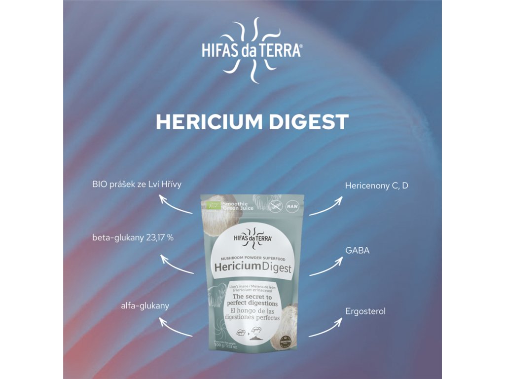 MICO LEO - Lví hříva neboli Hericium je známá také jako Yamabushitake, Hou Tou Gu (Monkey head mushroom) nebo hedgehog mushroom. Jde o vizuálně atraktivní houbu díky velké bílé "hřívě" vypadající jako zamrzlý vodopád. Hericium obsahuje bioaktivní sloučeniny a molekuly, jejichž vlastnosti souvisí s mikrobiomem, zažívacím traktem, kognitivními funkcemi a osou střeva-mozek.
