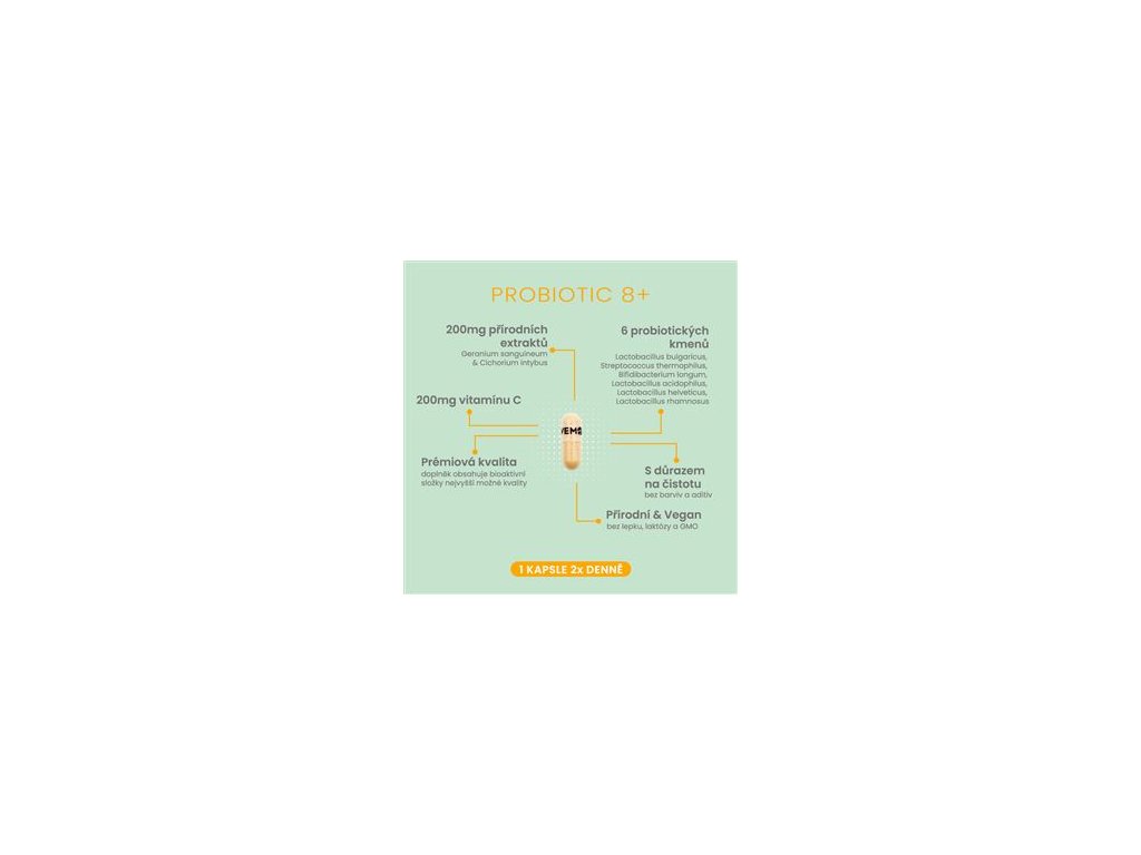 Probiotic 8+ Immuno je pokročilý komplex bioaktivních přírodních složek zaměřený na zažívací trakt, imunitu, regeneraci, vitalitu a osu zažívací trakt - mozek. Obsahuje šest probiotických kmenů (Lactobacillus bulgaricus, Streptococcus thermophilus, Bifidibacterium longum, Lactobacillus acidophilus, Lactobacillus helveticus, Lactobacillus rhamnosus) podporujících vyrovnaný stav mikrobiomu. Rovnováha probiotických bakterií ve střevě úzce souvisí se stavem imunitního systému, příjmem živin i psychikou (osa střevní trakt - mozek).