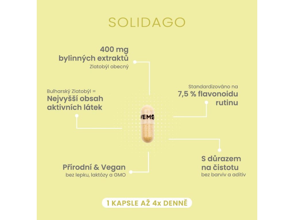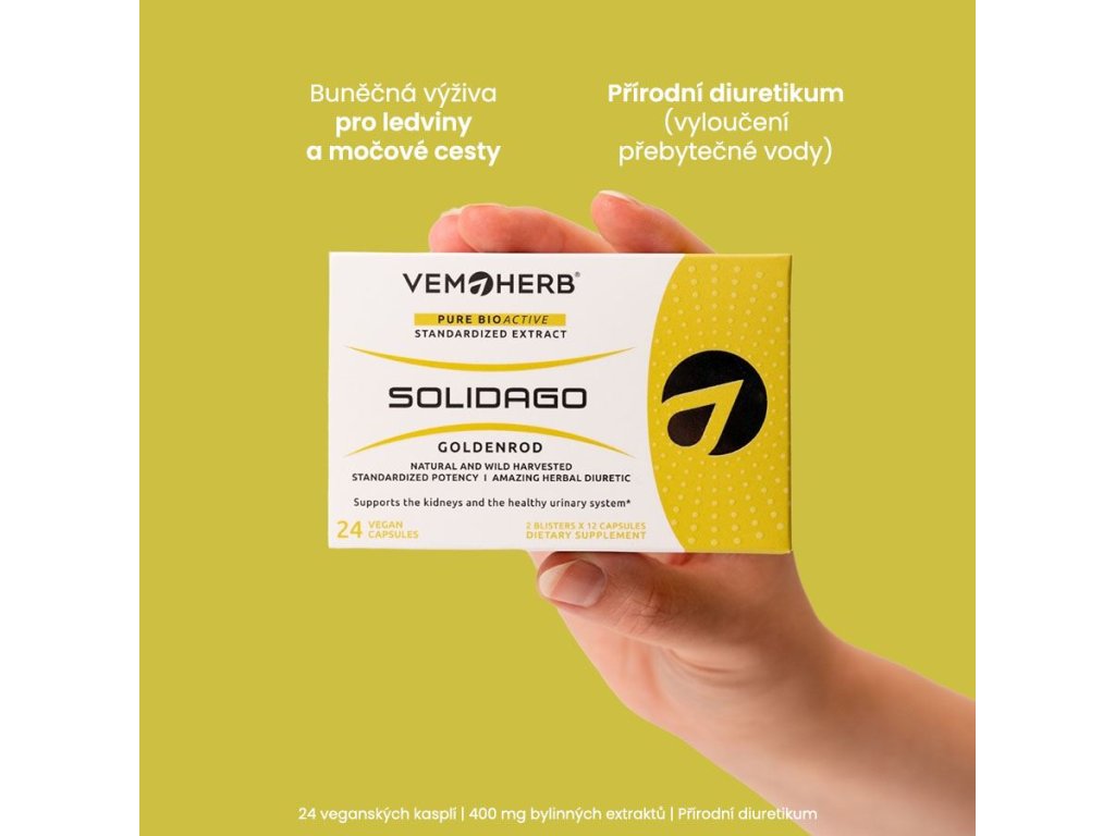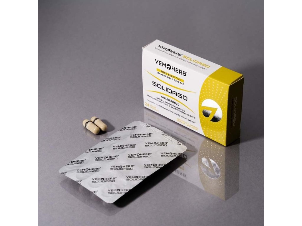 Vemoherb Solidago v novém praktickém balení v blistrech. Doplněk obsahuje suchý standardizovaný extrakt z nadzemní části rostliny Solidago vigaurea (Zlatobýl obecný). 1 kapsle obsahuje 400 mg extraktu standardizovaného na obsah 7,5 % flavonoidu rutinu. Extrakt ze Zlatobýlu obsahuje velmi široké spektrum biologicky aktivních substancí – flavonoidy rutin, quercetin a kempferol, glykosidy astragalin a rutosid, saponiny, fenolické sloučeniny, esenciální oleje, terpeny, antokyanidiny a další. Tyto látky vytváří velmi účinnou synergní směs zaměřenou na podporu ledvin, močového ústrojí, odvedení nadbytečné vody z těla a dalších oblasti.
