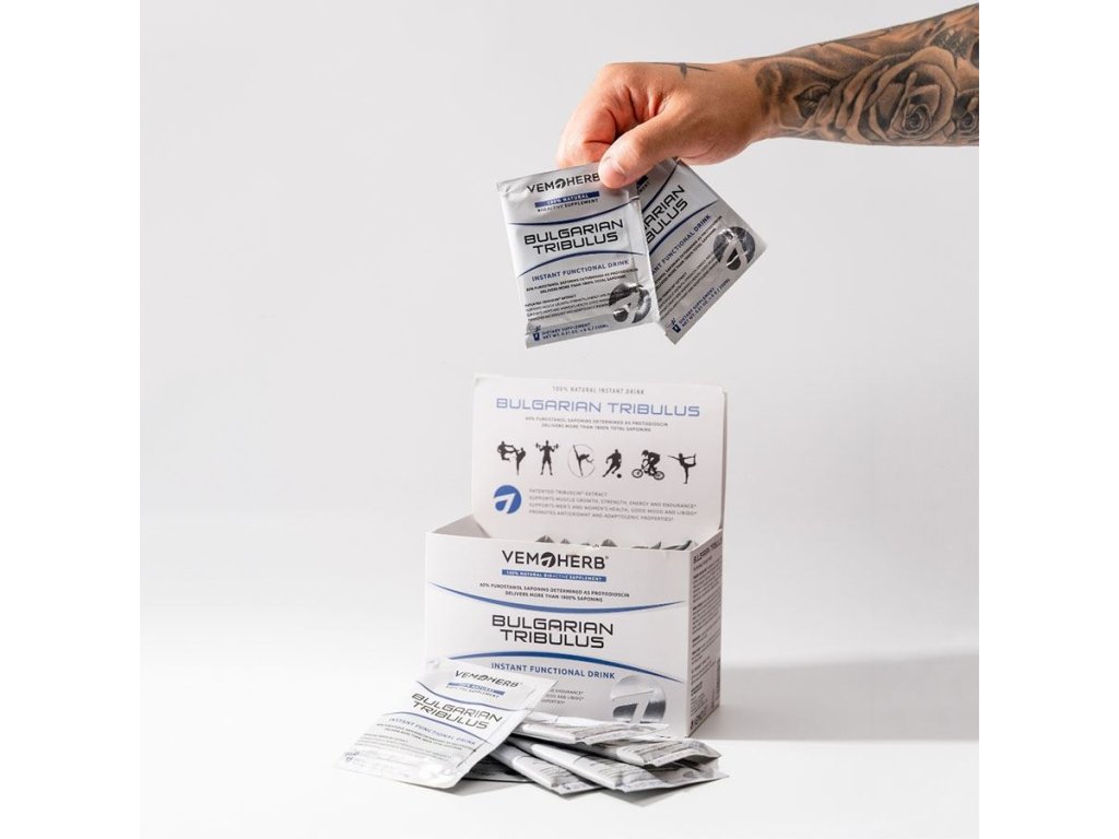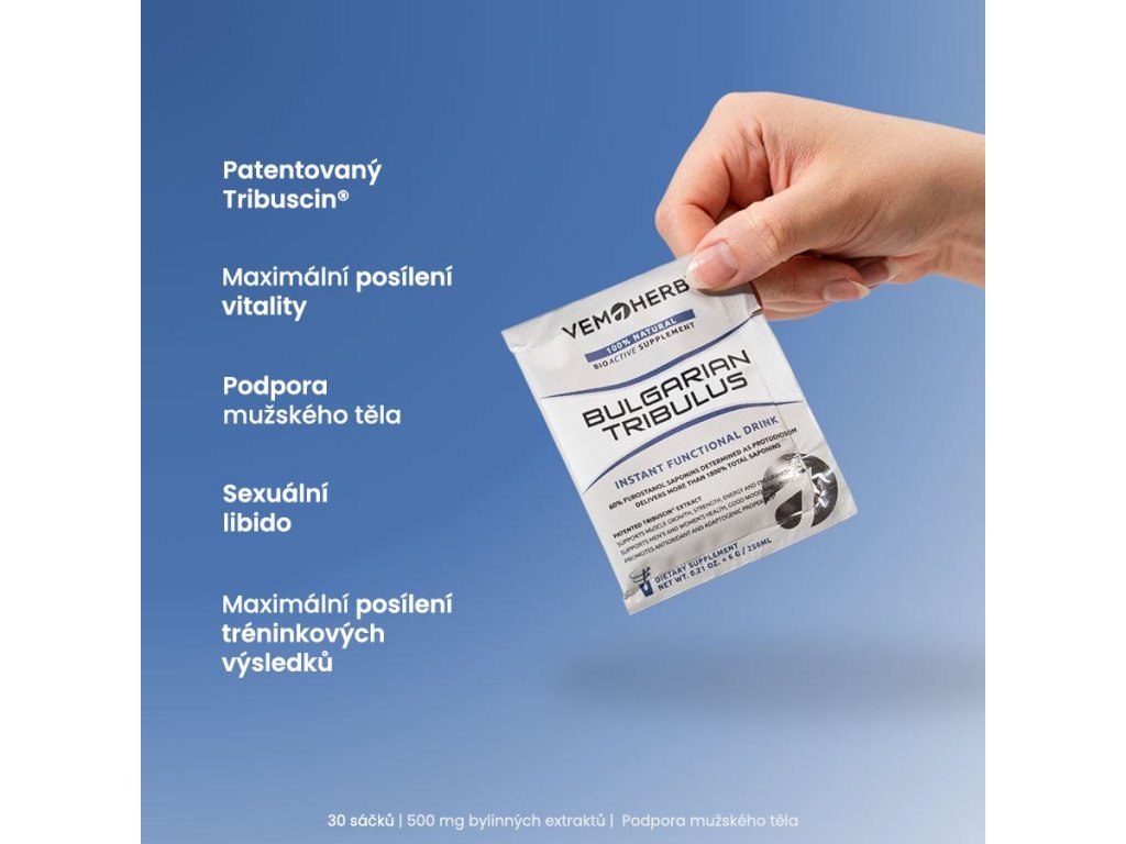 Originální bulharský VemoHerb Tribulus Terrestris s garantovaným obsahem 60% protodioscinu (furostanolový saponin) a vyváženým přirozeným obsahem prototribestinu, tribestinu a dioscinu (synergní furostanolové saponiny). (Viz - Bulharský tribulus, protodioscin a furostanolové saponiny).
