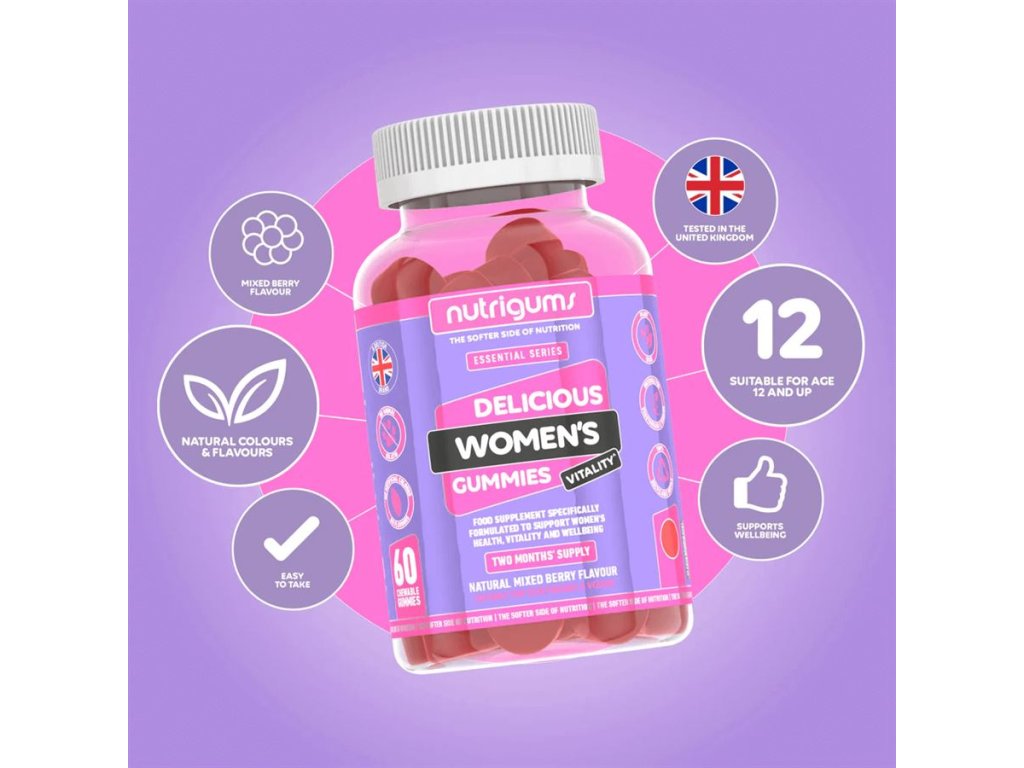 Vitamínová želé nemusí být plná umělých sladidel a barviv! Jde si pochutnat i bez syntetických látek. Želé Nutrigums® Women's Vitality má lahodnou přírodní příchuť lesní ovoce a lehce se konzumuje. Tělu dodává všechny benefity 19 bioaktivních látek - vitamínů, minerálů, probiotik a anthokyanů. Tento komplex posiluje obranný štít, podporuje vzhled, energetickou hladinu a také mikrobiom.